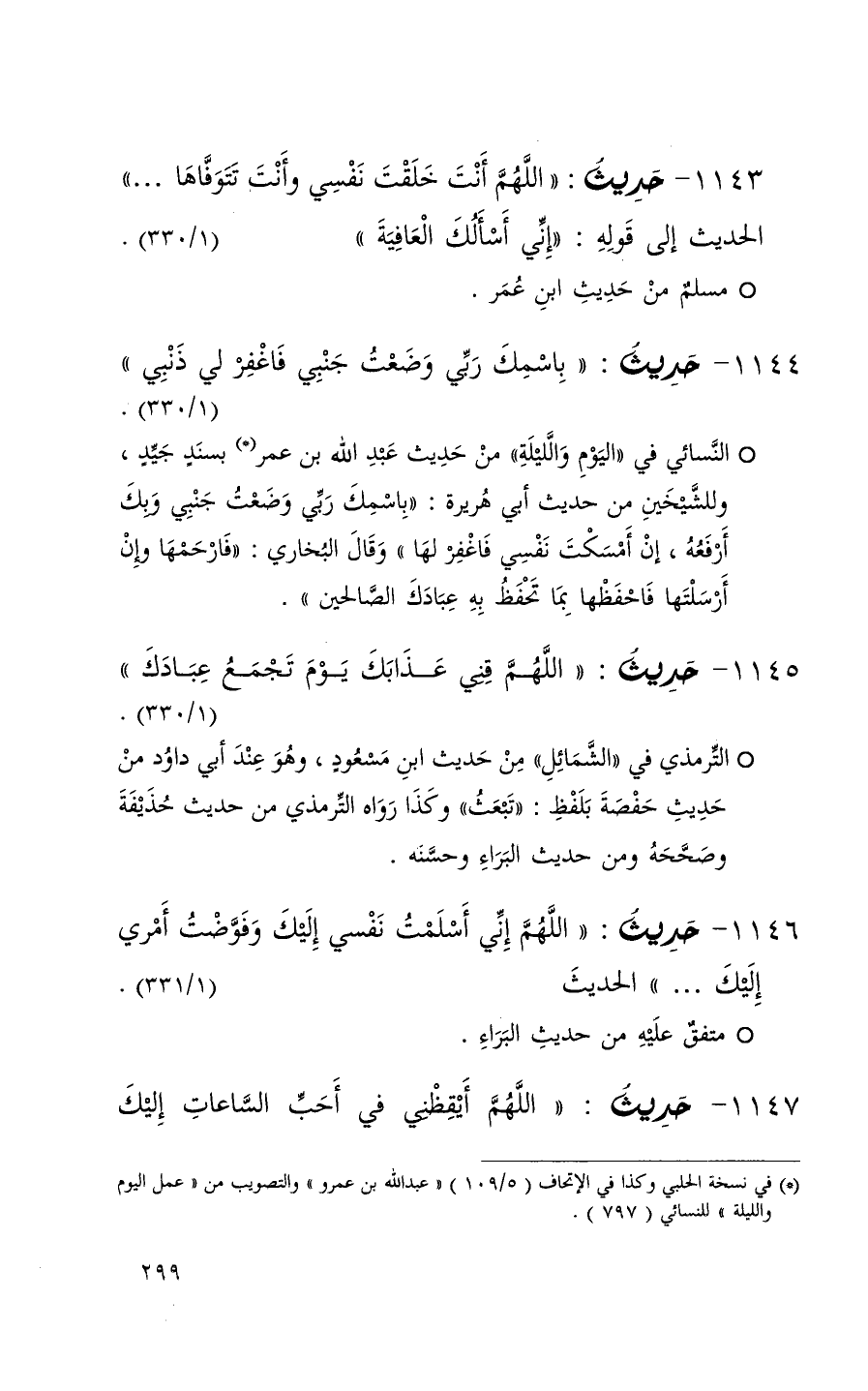 1143 حديث ( اللهم أنت خلقت نفسي وأنت تتوفاها 000 ) الحديث إلى قوله ( إني أسألك العافية ) ( 1 / 330 ) (1)