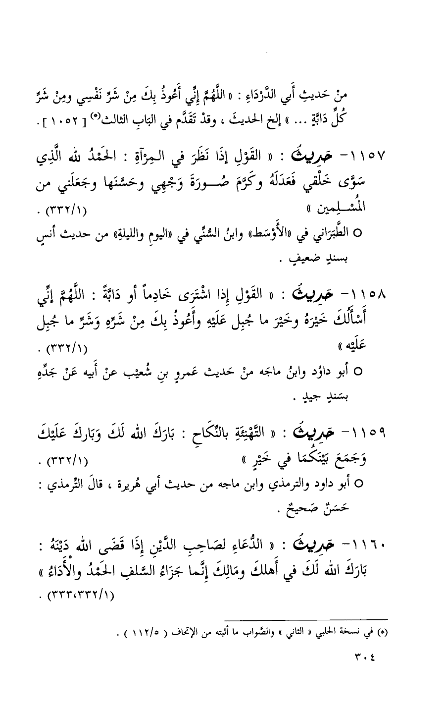 1157 حديث ( القول إذا نظر في المرآة الحمد لله الذي سوى خلقي فعدله وكرم صورة وجهي وحسنها وجعلني من المسلمين ) ( 1 / 332 )