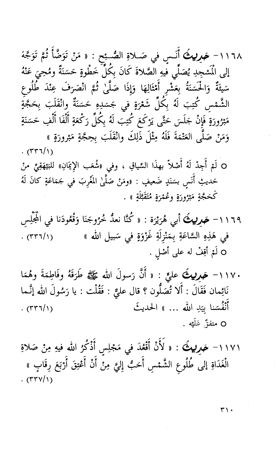 1168 حديث أنس في صلاة الصبح ( من توضأ ثم توجه إلى المسجد يصلي فيه الصلاة كان بكل خطوة حسنة ومحي عنه سيئة والحسنة بعشر أمثالها وإذا صلى ثم انصرف عند طلوع الشمس كتب له بكل شعرة في جسده حسنة وانقلب بحجة مبرورة فإن جلس حتى يركع كتب له بكل ركعة ألفا ألف حسنة ومن صلى العتمة فله مثل ذلك وانقلب بحجة مبرورة ) ( 1 / 336 ) (1)