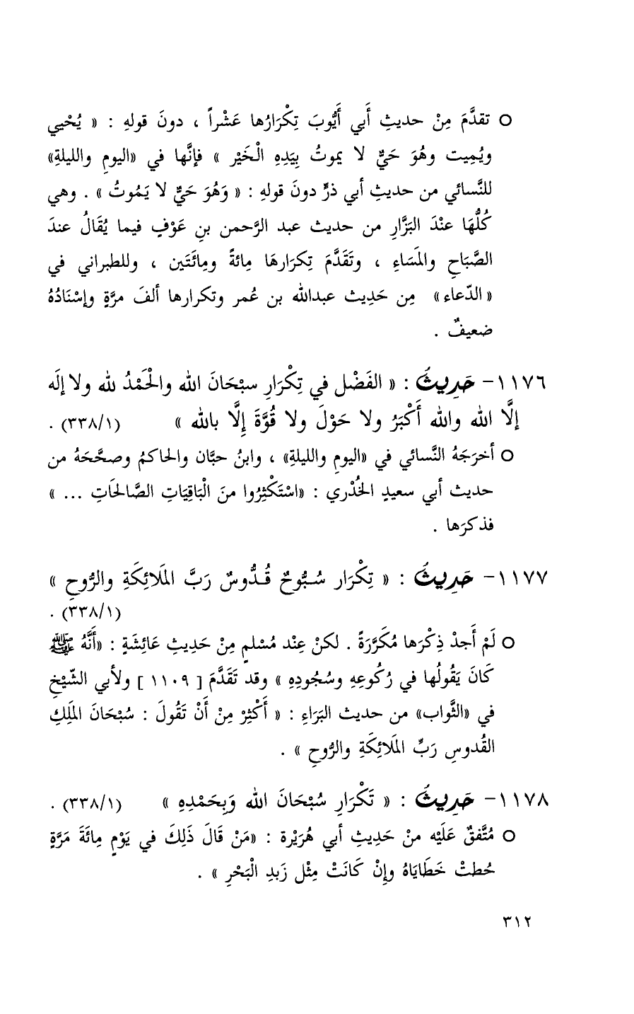 1178 حديث ( تكرار سبحان الله وبحمده ) ( 1 / 338 ) + متفق عليه من حديث أبي هريرة ( من قال ذلك في يوم مائة مرة حطت خطاياه وإن كانت مثل زبد البحر )