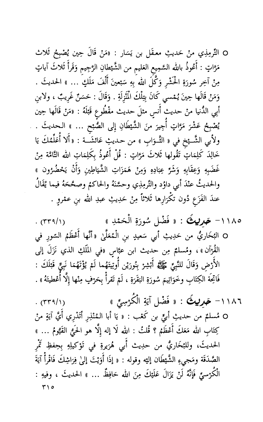 1186 حديث ( فضل آية الكرسي ) ( 1 / 339 ) + مسلم من حديث أبي بن كعب ( يا أبا المنذر أتدري أي آية من كتب الله معك أعظم قلت الله لا إله إلا هو الحي القيوم 000 ) الحديث وللبخاري من حديث أبي هريرة في توكيله بحفظ تمر الصدقة ومجيء الشيطان إليه وقوله ( إذا أويت إلى فراشك فاقرأ آية الكرسي فإنه لن يزال عليك من الله حافظ 000 ) الحديث وفيه