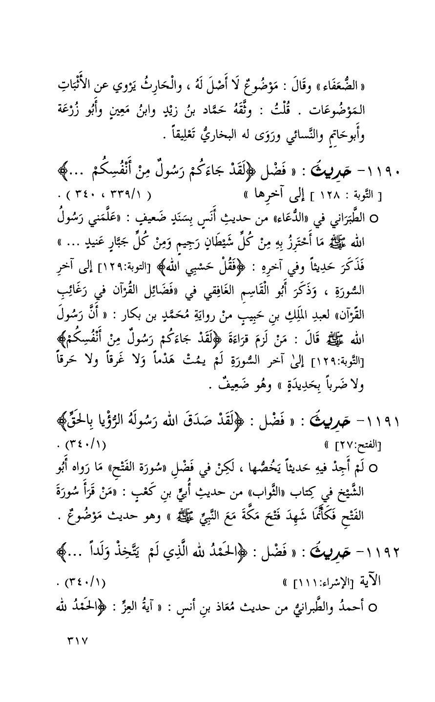 الضعفاء وقال موضوع لا أصل له والحارث يروي عن الأثبات الموضعات قلت وثقه حماد بن زيد وابن معين وأبو زرعة وأبو حاتم والنسائي وروى له البخاري تعليقاً (1) الطبراني في الدعاء من حديث أنس بسند ضعيف ( علمني رسول اله ما احترز به من كل شيطان رجيم ومن كل جبار عنيد 000 ) فذكر حديثاً وفي آخره ( فقل ^ حسبي الله ) التوبة 129 إلى آخر السورة وذكر أبو القاسم الغافقي في فضائل القرآن في رغائب القرآن لعبد الملك بن حبيب من رواية محمد بن بكار ( أن رسول الله قال من لزم قراءة ( ^ لقد جاءكم رسول من أنفسكم ) التوبة إلى آخر السورة لم يمت هدماً ولا غرقاً ولاحرقاً ولا ضرباً بحديدة ) وهو ضيف +
