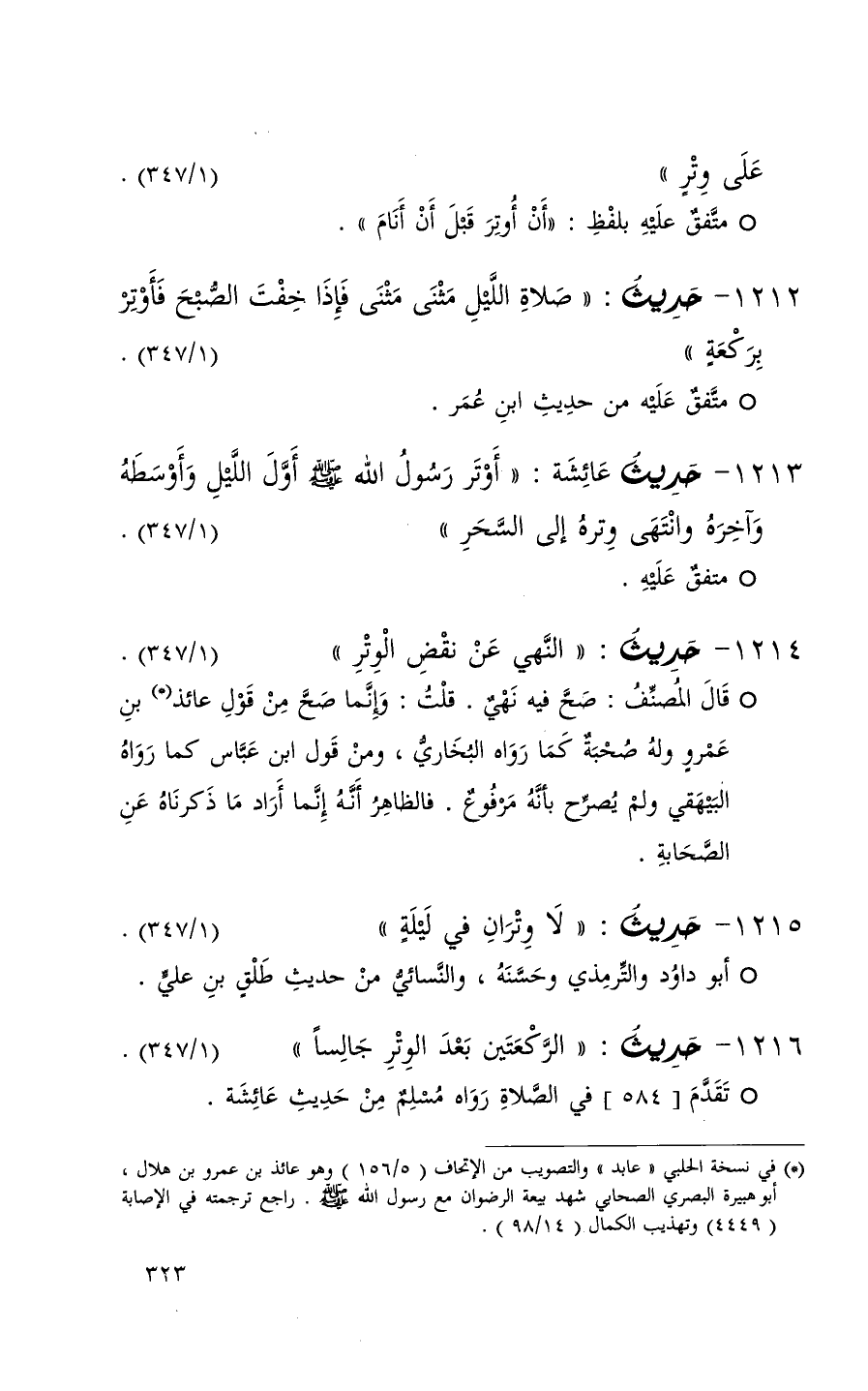 1214 حديث ( النهي عن نقض الوتر ) ( 1 / 347 ) + قال المنصف صح فيه نهي قلت وإنما صح من قول عائذ بن عمرو وله صحبة كما رواه البخاري ومن قول ابن عباس كما رواه البهقي ولم يصرح بأنه مرفوع فالظاهر أنه إنما أراد ما ذكرناه عن الصحابة +