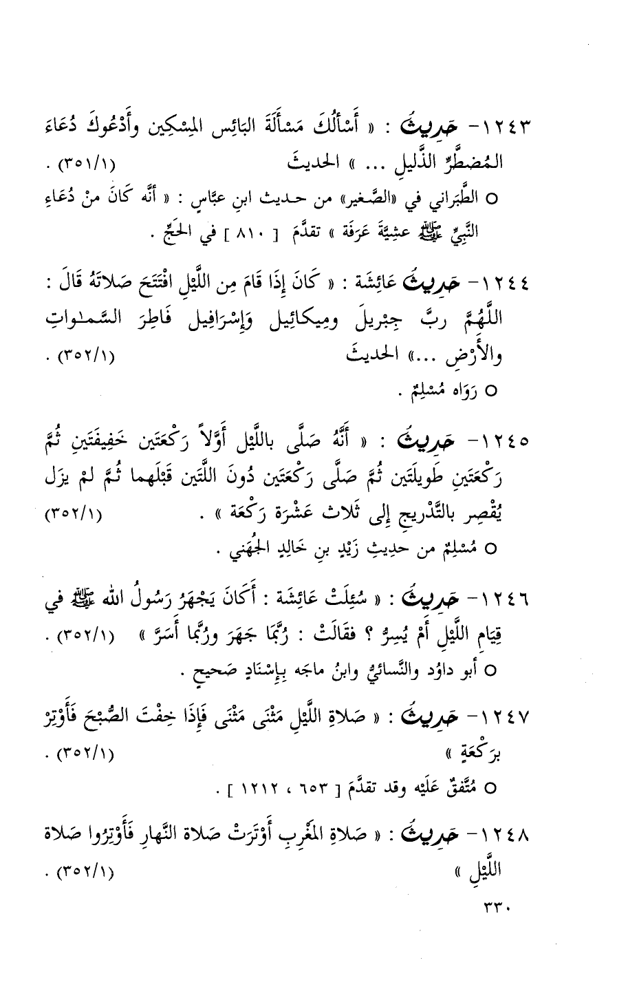 1243 حديث ( أسألك مسألة البائس المسكين وأدعوك دعاء المضطر الذليل . . . ) الحديث ( 1 / 351 ) (1)