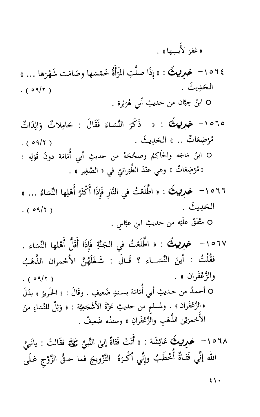 1566 حديث ( اطلعت في النار فإذا أكثر أهلها النساء . . . ) الحديث ( 2 / 59 ) + متفق عليه من حديث ابن عباس +