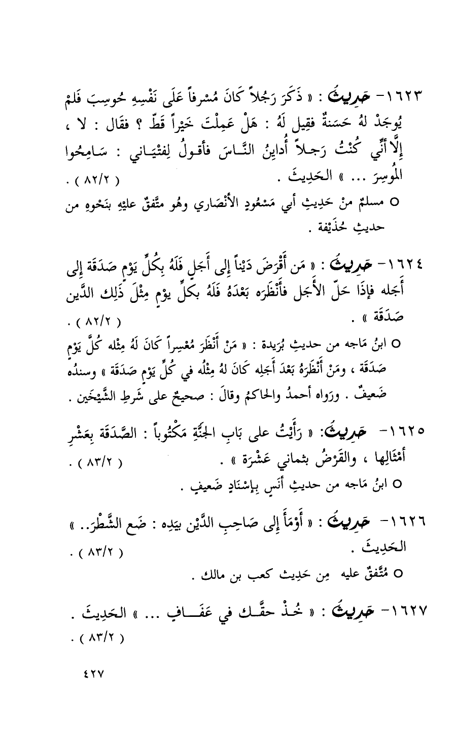 1624 حديث ( من أقرض ديناً إلى أجل فله بكل يوم صدقة إلى أجله فإذا حل الأجل فأنظره بعده فله بكل يوم مثل ذلك الدين صدقة ) ( 2 / 82 ) + ابن ماجه من حديث بريدة ( من أنظر معسراً كان له مثله كل يوم صدقة ومن أنظره بعد أجله كان له مثله في كل يوم صدقة ) وسنده ضعيف ورواه أحمد والحاكم وقال صحيح على شرط الشيخين +