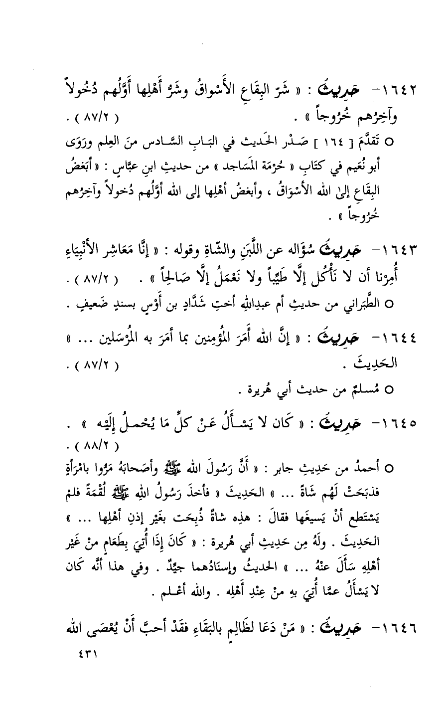 1642 حديث ( شر البقاع الأسواق وشر أهلها أولهم دخولاً وآخرهم خروجاً ) ( 2 / 87 ) (1)