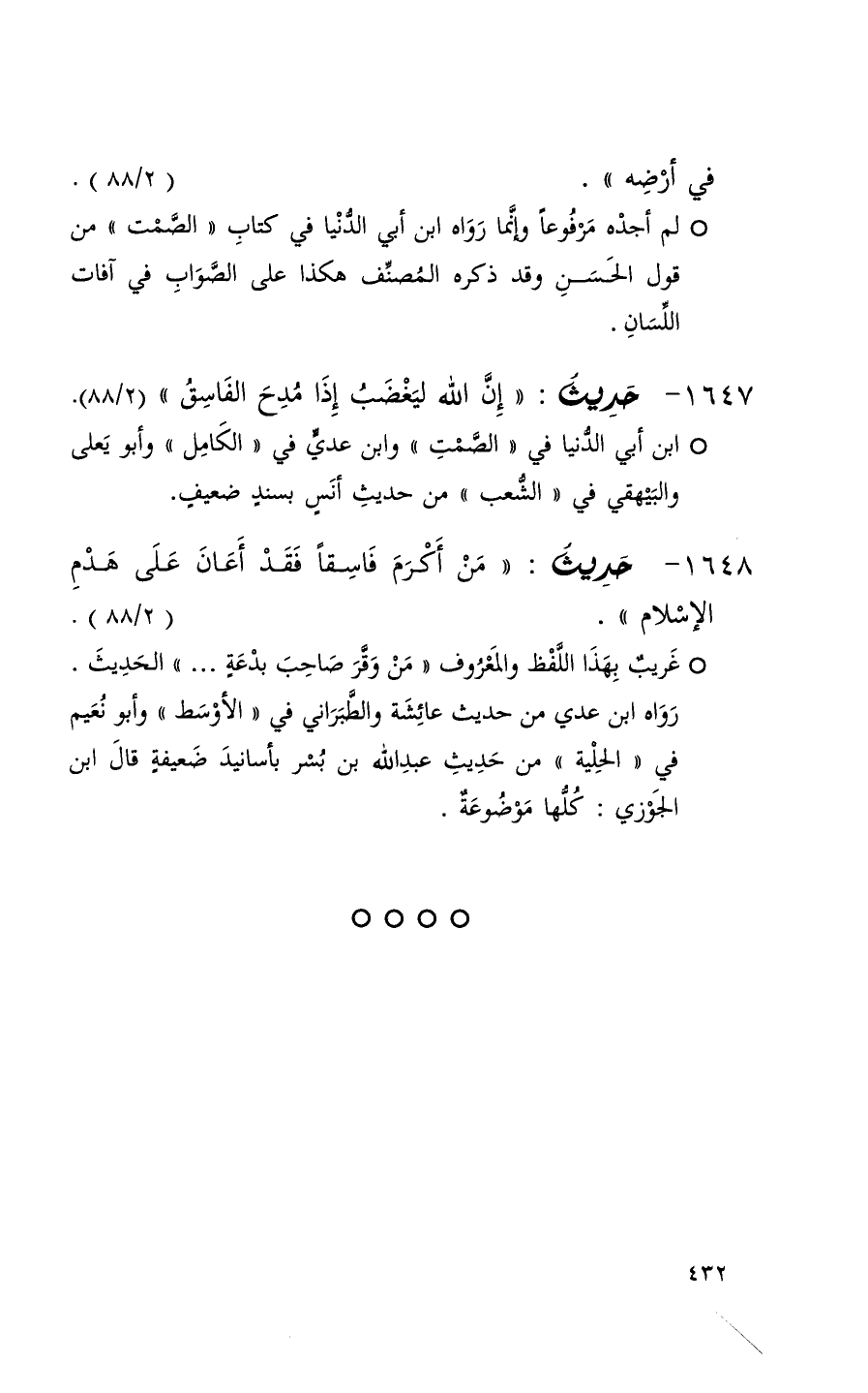 1647 حديث ( إن الله ليغضب إذا مدح الفاسق ) ( 2 / 88 ) + ابن أبي الدنيا في الصمت وابن عدي في الكامل وأبو يعلى والبيهقي في الشعب من حديث أنس بسند ضعيف +