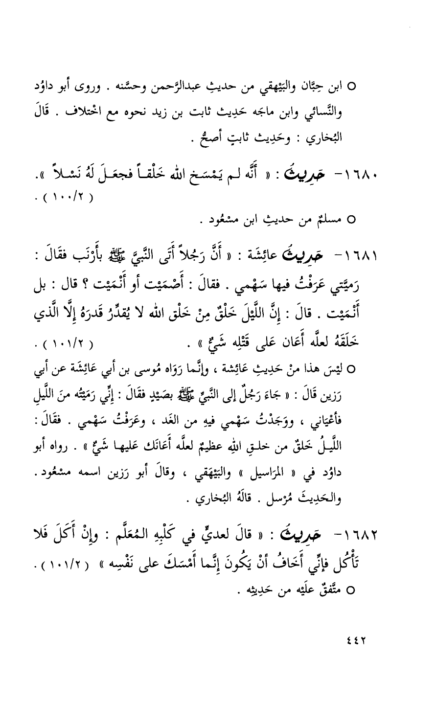 1681 حديث عائشة ( أن رجلاً أتى النبي بأرنب فقال رميتي عرفت فيها سهمي فقال أصميت أو أنميت قال بل أنميت قال إن الليل خلق من خلق الله لا يقدر قدره إلا الذي خلقه لعله أعان على قتله شيء ) ( 1 / 101 ) + ليس هذا من حديث عائشة وإنما رواه موسى بن أبي عائشة عن أبي رزين قال ( جاء رجل إلى النبي بصيد فقال إني رميته من الليل فأعياني ووجدت سهمي فيه من الغد وعرفت سهمي فقال الليل خلق من خلق الله عظيم لعله أعانك عليها شيء ) رواه أبو داود في المراسيل والبيهقي وقال أبو رزين اسمه مسعود والحديث مرسل قاله البخاري +
