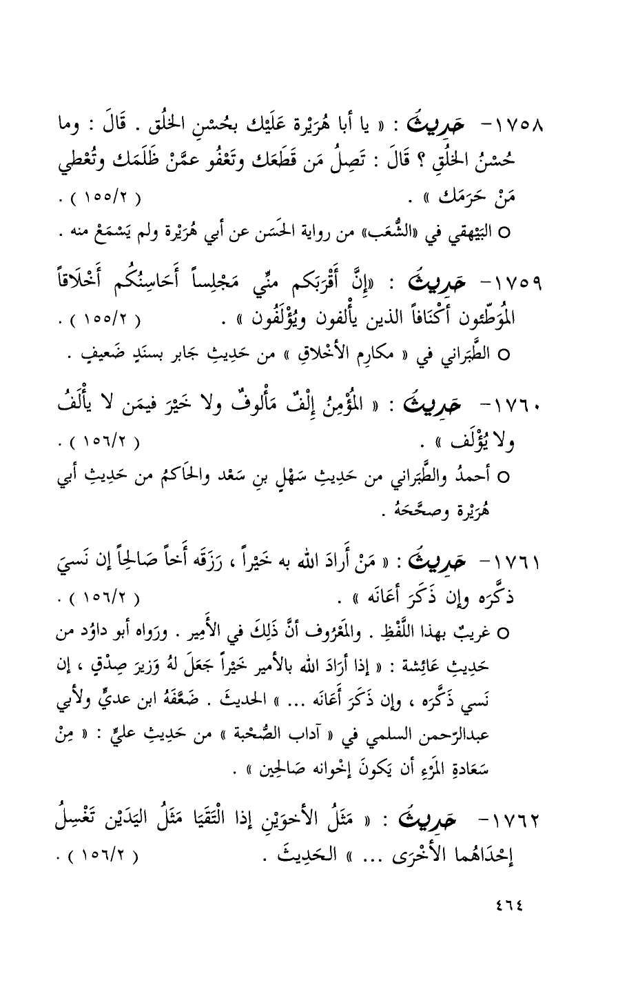 1758 حديث ( يا أبا هريرة عليك بحسن الخلق قال وما حسن الخلق قال تصل من قطعك وتعفو عمن ظلمك وتعطي من حرمك ) ( 2 / 155 ) (1)