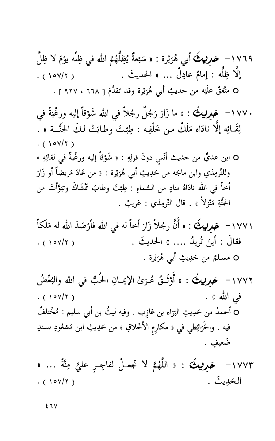 1769 حديث أبي هريرة ( سبعة يظلهم الله في ظله يوم لا ظل إلاظله إمام عادل 000 ) الحديث ( 2 / 157 ) (1)