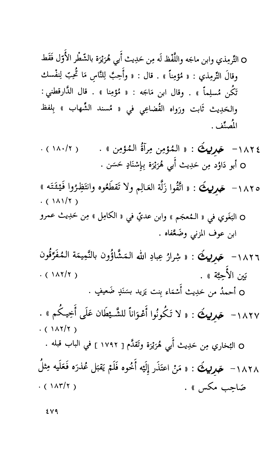 1826 حديث ( شرار عباد الله المشاؤون بالنميمة المفرقون بين الأحبة ) ( 2 / 182 ) + أحمد من حديث أسماء بنت يزيد بسند ضعيف +