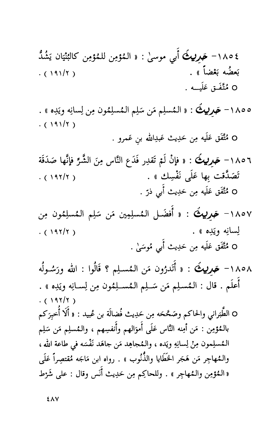 1855 حديث ( المسلم من سلم المسلمون من لسانه ويده ) ( 2 / 191 ) + متفق عليه من حديث عبد الله بن عمرو +