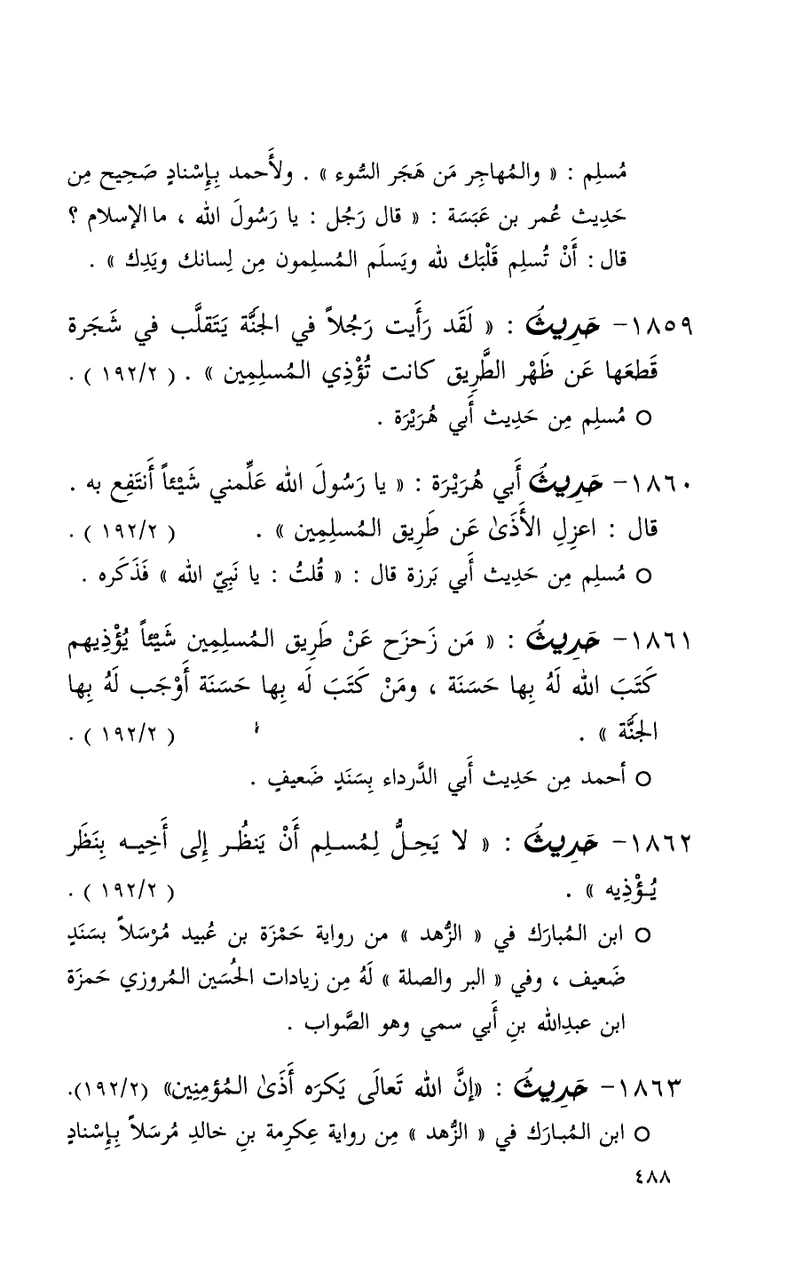 1859 حديث ( لقد رأيت رجلاً في الجنة يتقلب في شجرة قطعها عن ظهر الطريق كانت تؤذي المسلمين ) ( 2 / 192 )