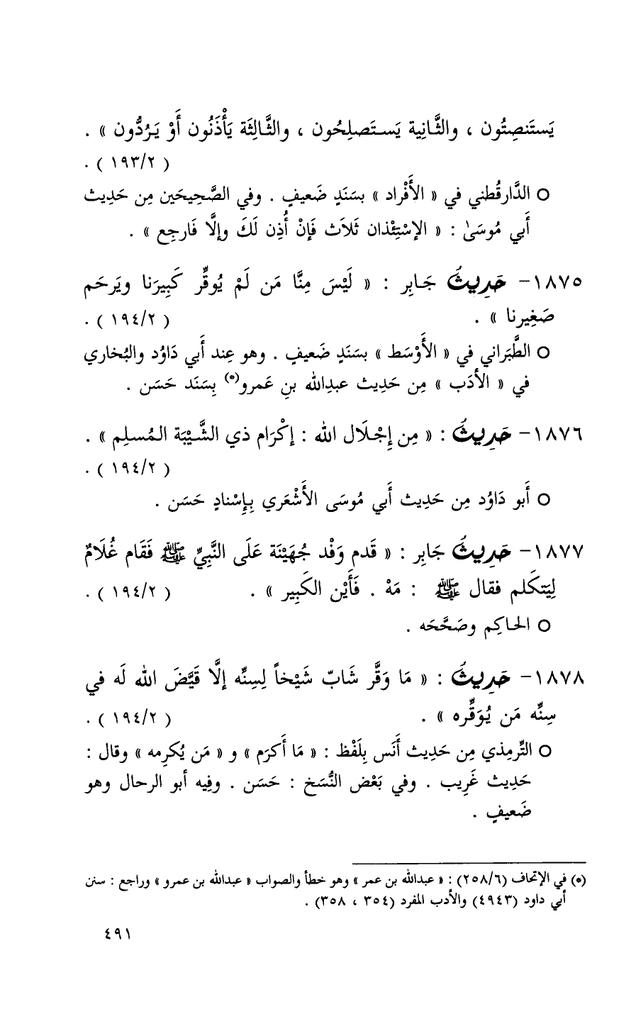 1875 حديث جابر ( ليس منا من لم يوقر كبيرنا ويرحم صغيرنا ) ( 2 / 194 )