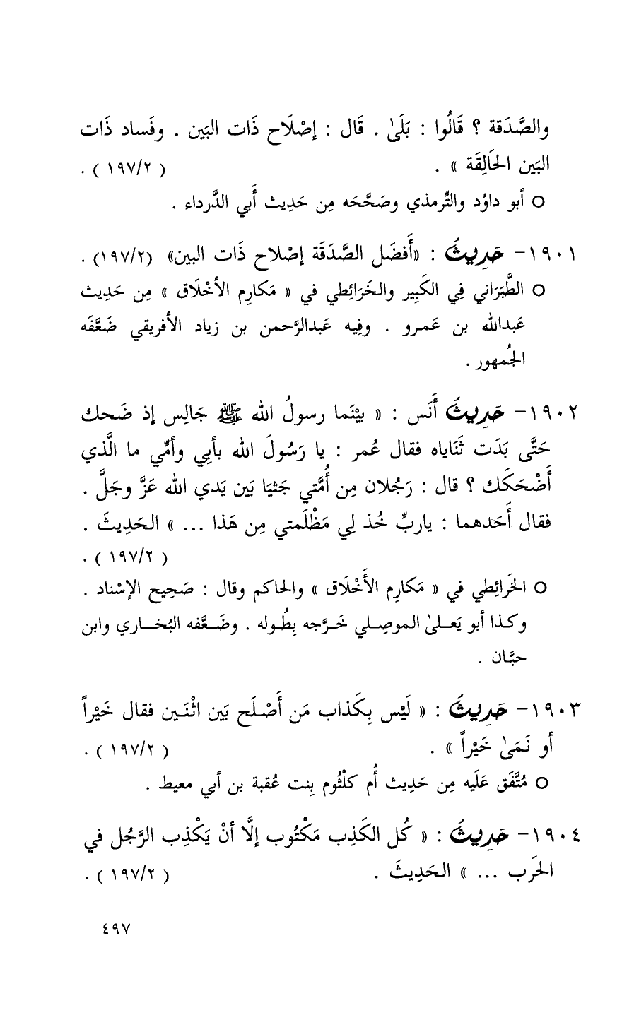 والصدقة قالوا بلى قال إصلاح ذات البين وفساد ذات البين الحالقة ) ( 2 / 197 ) (1)