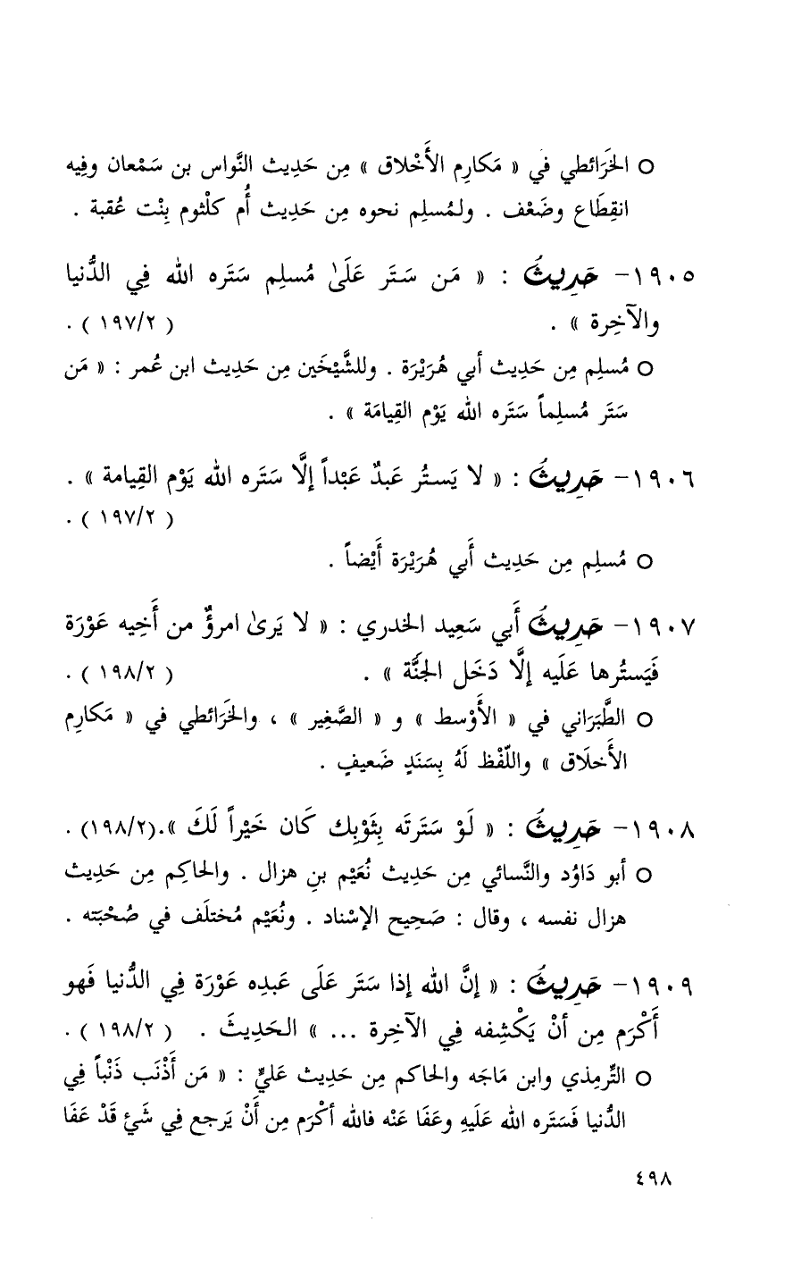 1907 حديث أبي سعيد الخدري ( لا يرى امرؤ من أخيه عورة فيسترها عليه إلا دخل الجنة ) ( 2 / 198 ) + الطبراني ي الأوسط والصغير والخرائطي في مكارم الأخلاق واللفظ له بسند ضعيف +