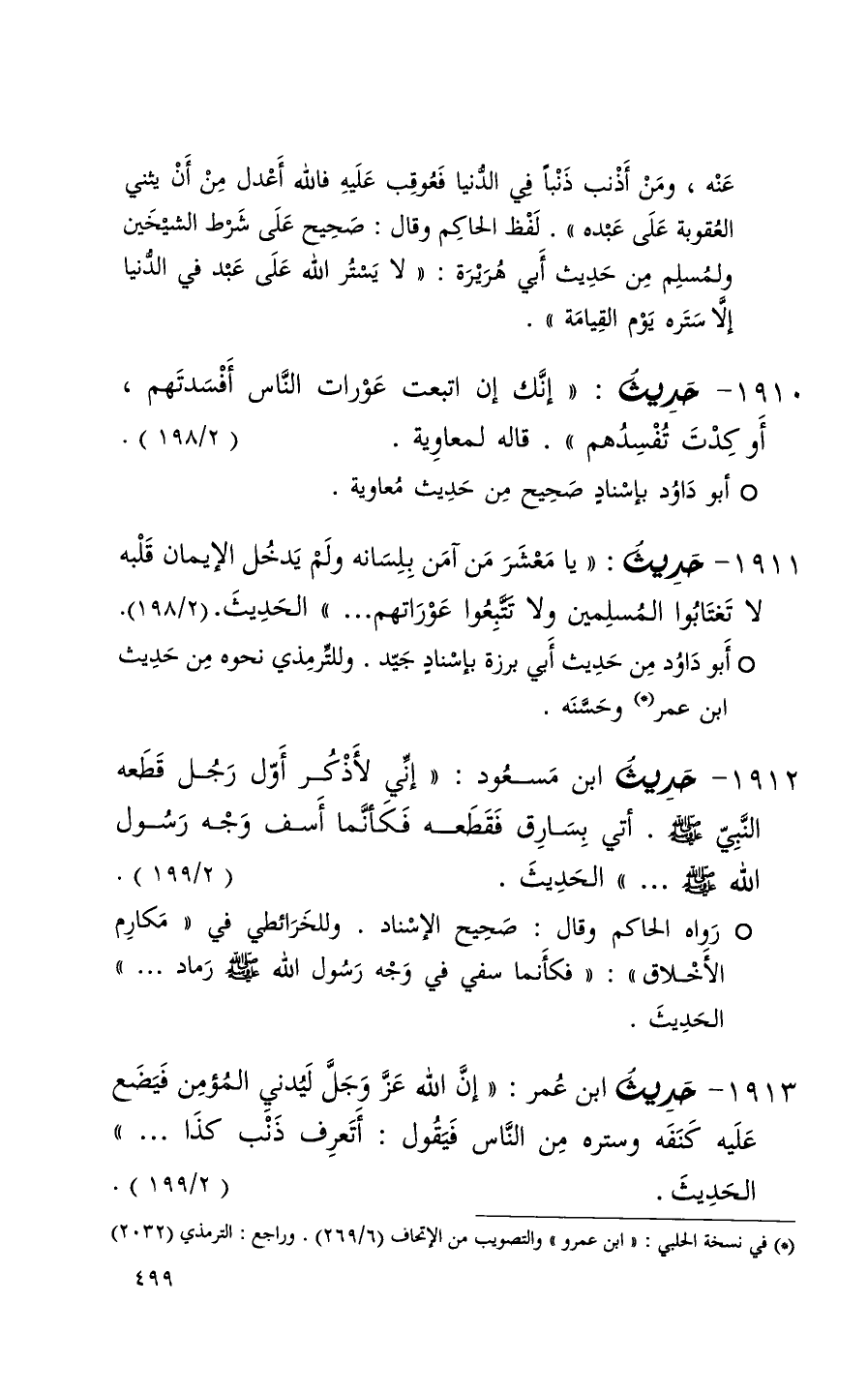 1912 حديث ابن مسعود ( إني لأذكر أول رجل قطعه النبي أتي بسارق فقطعه فكأنما أسف وجه رسول الله . . . ) الحديث ( 2 / 199 ) + رواه الحاكم وقال صحيح الإسناد وللخرائطي في مكارم الأخلاق فكأنما سفي في وجه رسول الله رماد . . . ) الحديث +