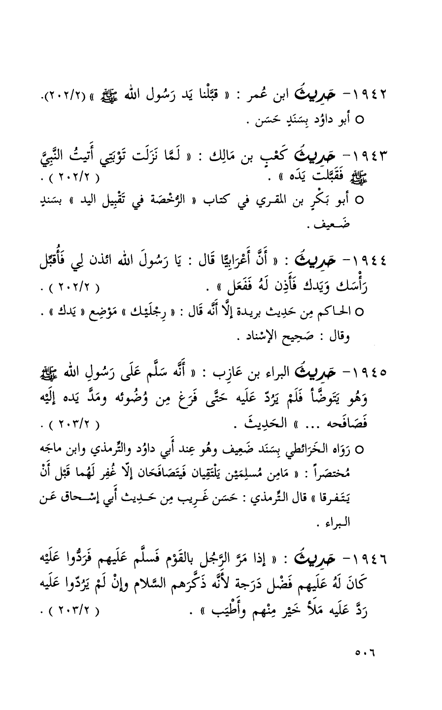 1945 حديث البراء بن عازب ( أنه سلم على رسول الله وهو يتوضأ فلم يرد عليه حتى فرغ من وضوئه ومد يده إليه فصافحه 000 ) الحديث ( 2 / 203 ) + رواه الخرائطي بسند ضعيف وهو عند أبي داود والترمذي وابن ماجه مختصراً ( ما من مسلمين يلتقيان فيتصافحان إلا غفر لهما قبل أن يتفقا ) قال الترمذي حسن غريب من حديث أبي إسحاق عن البراء +