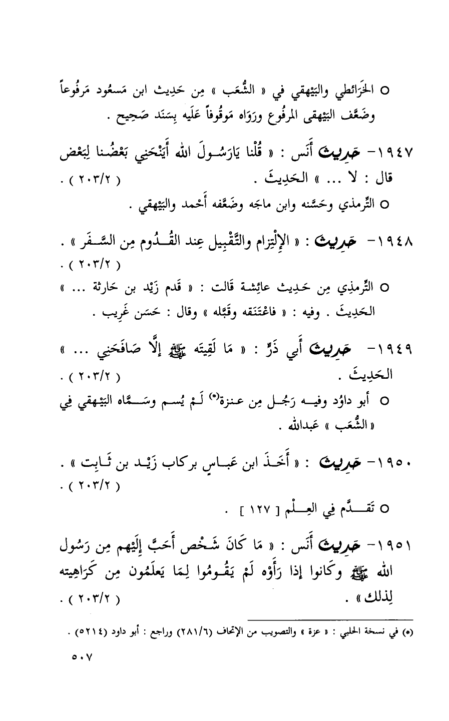 1951 حديث أنس ( ما كان شخص أحب إليهم من رسول الله وكانوا إذا رأوه لم يقوموا لما يعلمون من كراهيته لذلك ) ( 2 / 203 )