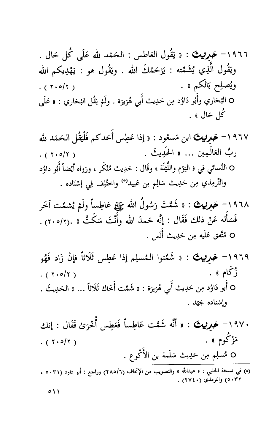 1966 حديث ( يقول العاطس الحمد لله على كل حال ويقول الذي يشمته يرحمك الله ويقول هو يهديكم الله ويصلح بالكم ) ( 23 / 205 ) (1)