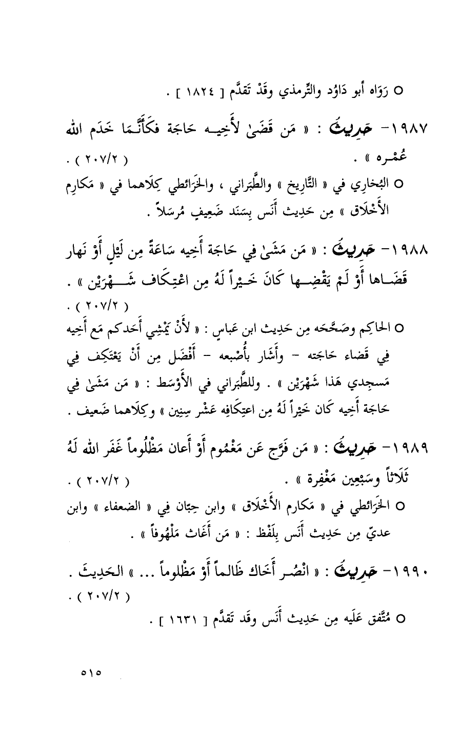 1987 حديث ( من قضى لأخيه حاجة فكأنما خدم الله عمره ) ( 2 / 207 ) + البخاري في التاريخ والطبراني والخرائطي كلاهما في مكارم الأخلاق من حديث أنس بسند ضعيف مرسلاً +