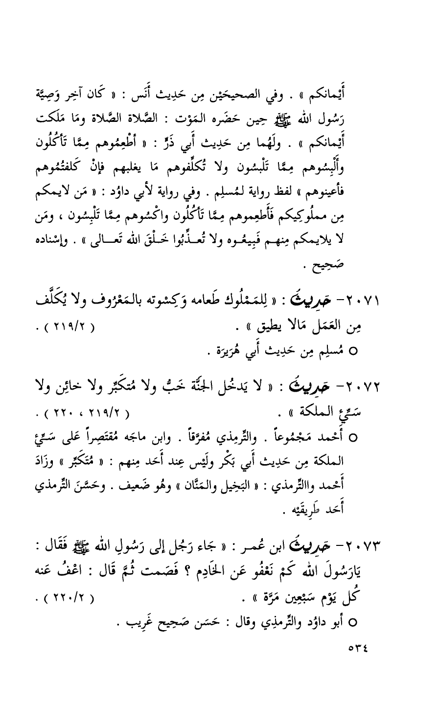 2071 حديث ( للمملوك طعامه وكسوته بالمعروف ولا يكلف من العمل ما لا يطيق ) ( 2 / 219 )