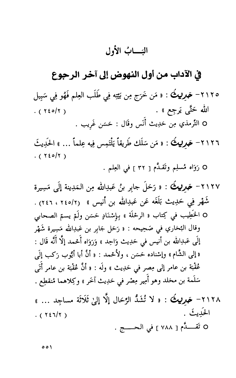 2127 حديث ( رحل جابر بن عبد الله من المدينة إلى مسيرة شهر في حديث بلغه عن عبد الله بن أنيس ) ( 2 / 245ِ 246 ) + الخطيب في كتاب الرحلة بإسناد حسن ولم يسم الصحابي وقال البخاري في صحيحه ( رحل جابر بن عبد الله مسيرة شهر إلى عبد الله بن أنيس في حديث واحد ) ورواه أحمد إلا أنه قال إلى الشام وإسناده حسن ولأحمد ( أن أبا أيوب ركب إلى عقبة بن عامر إلى مصر في حديث ) وله ( أن عقبة بن عامر أتى سلمة بن مخلد وهو أمير مصر في حديث آخر ) وكلاهما منقطع +