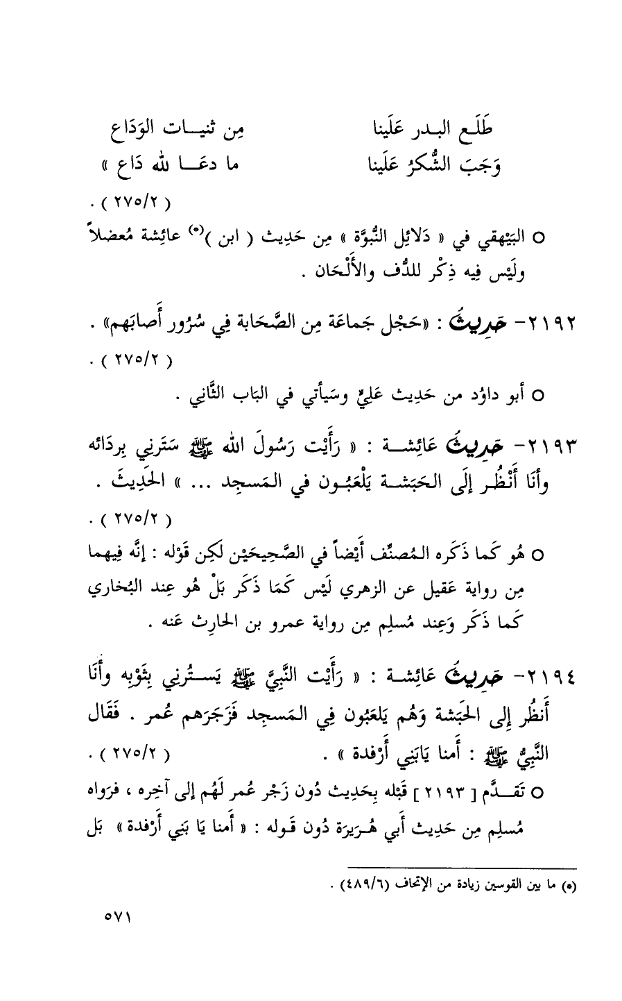2194 حديث عائشة ( رأيت النبي يسترني بثوبه وأنا أنظر إلى الحبشة وهم يلعبون في المسجد فزجرهم عمر فقال النبي أمنا يا بني أرفدة ) ( 2 / 275 ) + تقدم 2193 قبله بحديث دون زجر عمرلهم إلى آخره فرواه مسلم من حديث أبي هريرة دون قوله ( أمنا يا بني أرفدة ) بل