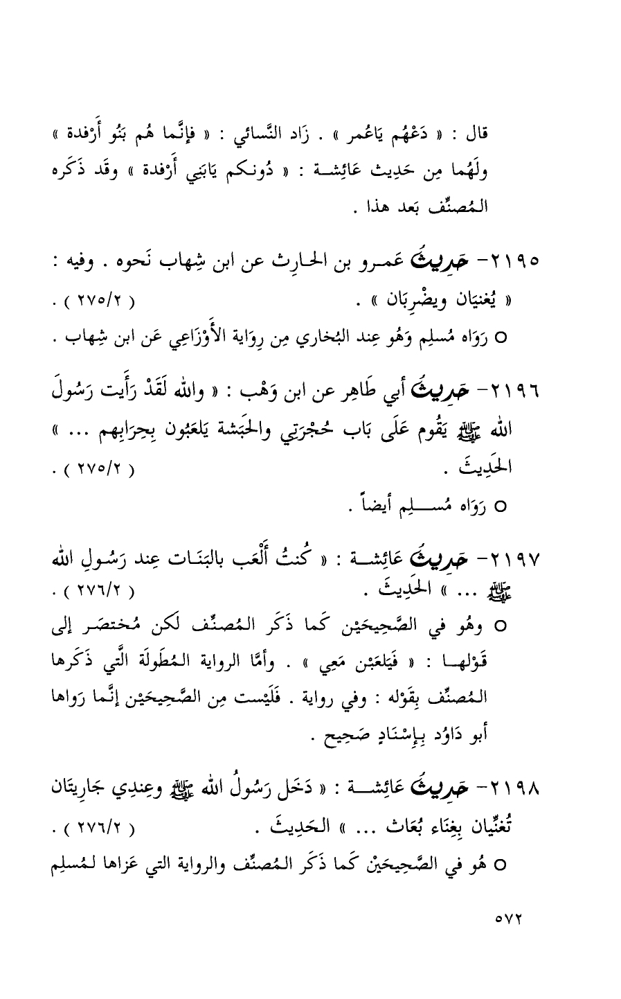 2196 حديث أبي طاهر عن ابن وهب ( والله لقد رأيت رسول الله يقوم على باب حجرتي والحبشة يلعبون بحرابهم 00 ) الحديث ( 2 / 275 ) + رواه مسلم أيضاً +
