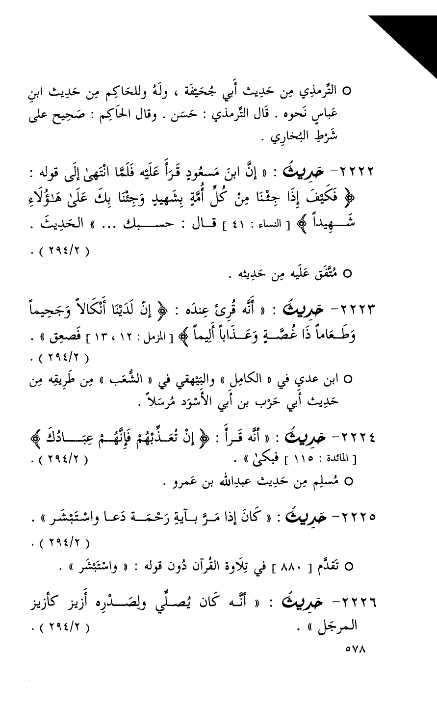 2222 حديث ( إن ابن مسعود قرأ عليه فلما انتهى إلى قوله ( ^ فكيف إذا جئنا من كل أمة بشهيد وجئنا بك على هؤلاء شهيدا ) النساء 41 قال حسبك . . . ) الحديث ( 2 / 294 )