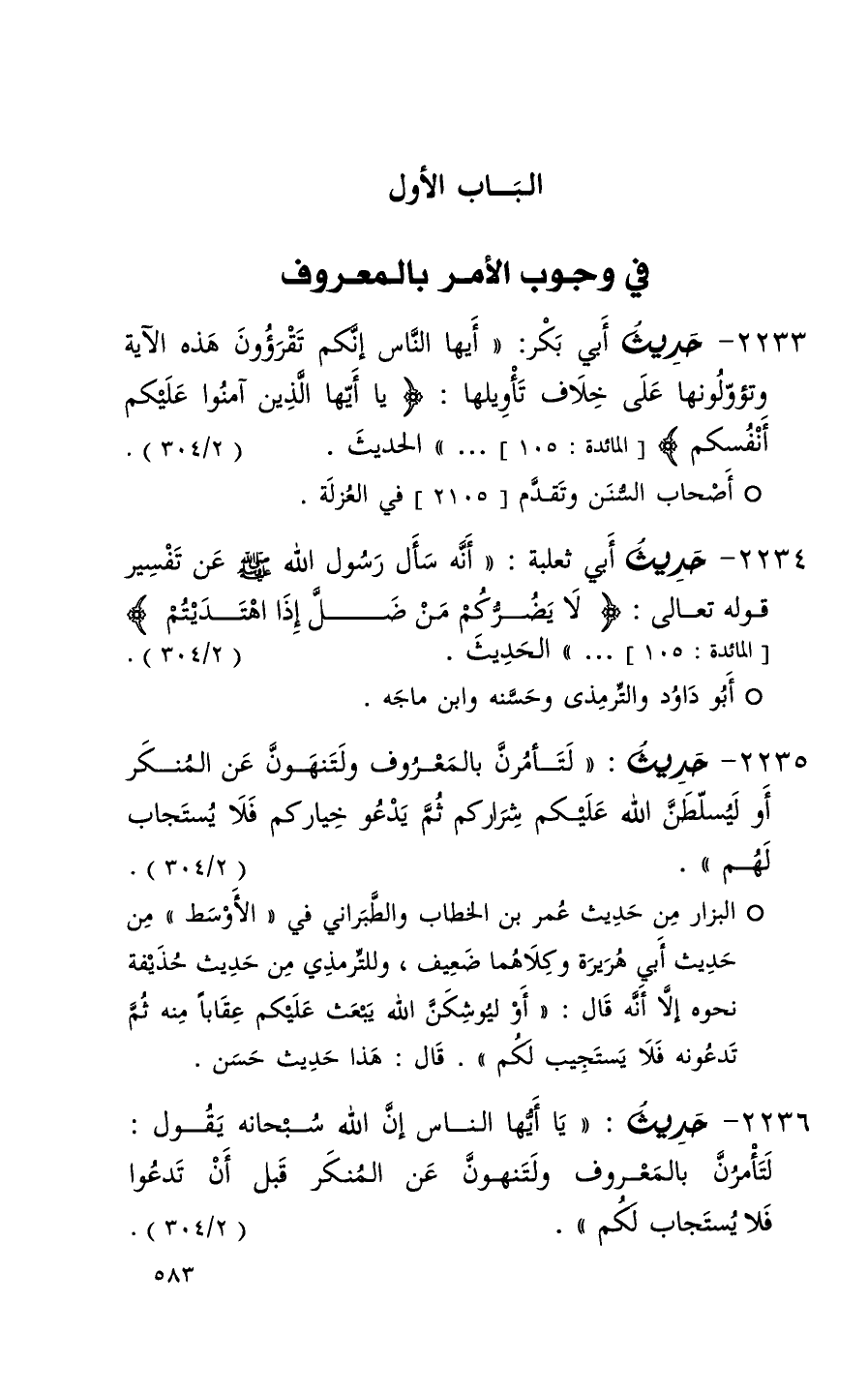2234 حديث أبي ثعلبة ( أنه سأل رسول اله عن تفسير قوله تعالى ( ^ لا يضركم من ضل إذا اهتديتم ) المائدة 105 . . . ) الحديث ( 2 / 204 ) + أبو داود والترمذي وحسنه وابن ماجه +