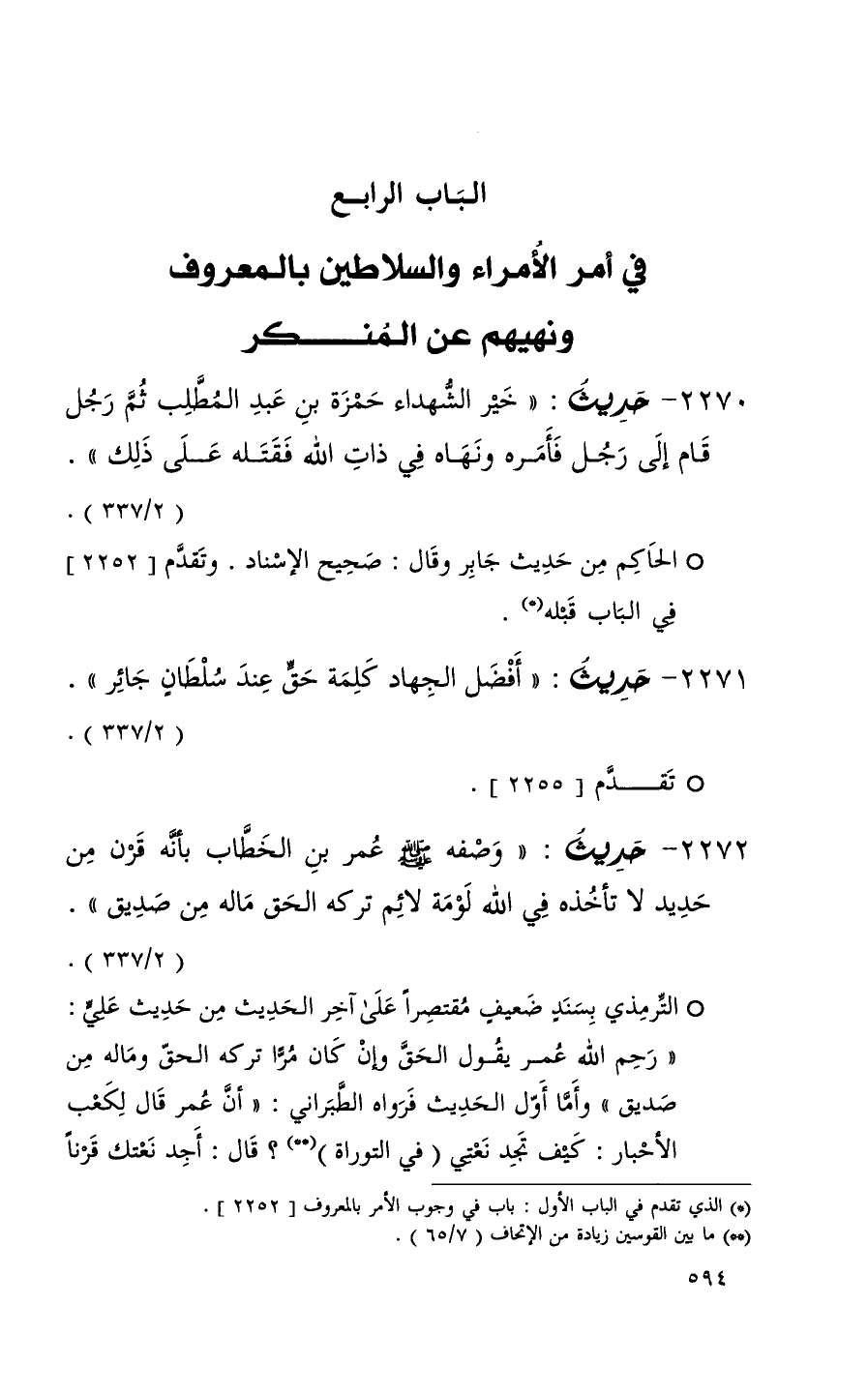 2270 حديث ( خير الشهداء حمزة بن عبد المطلب ثم رجل قام إلى رجل فأمره ونهاه في ذات الله فقتله على ذلك ) ( 2 / 337 ) (1)
