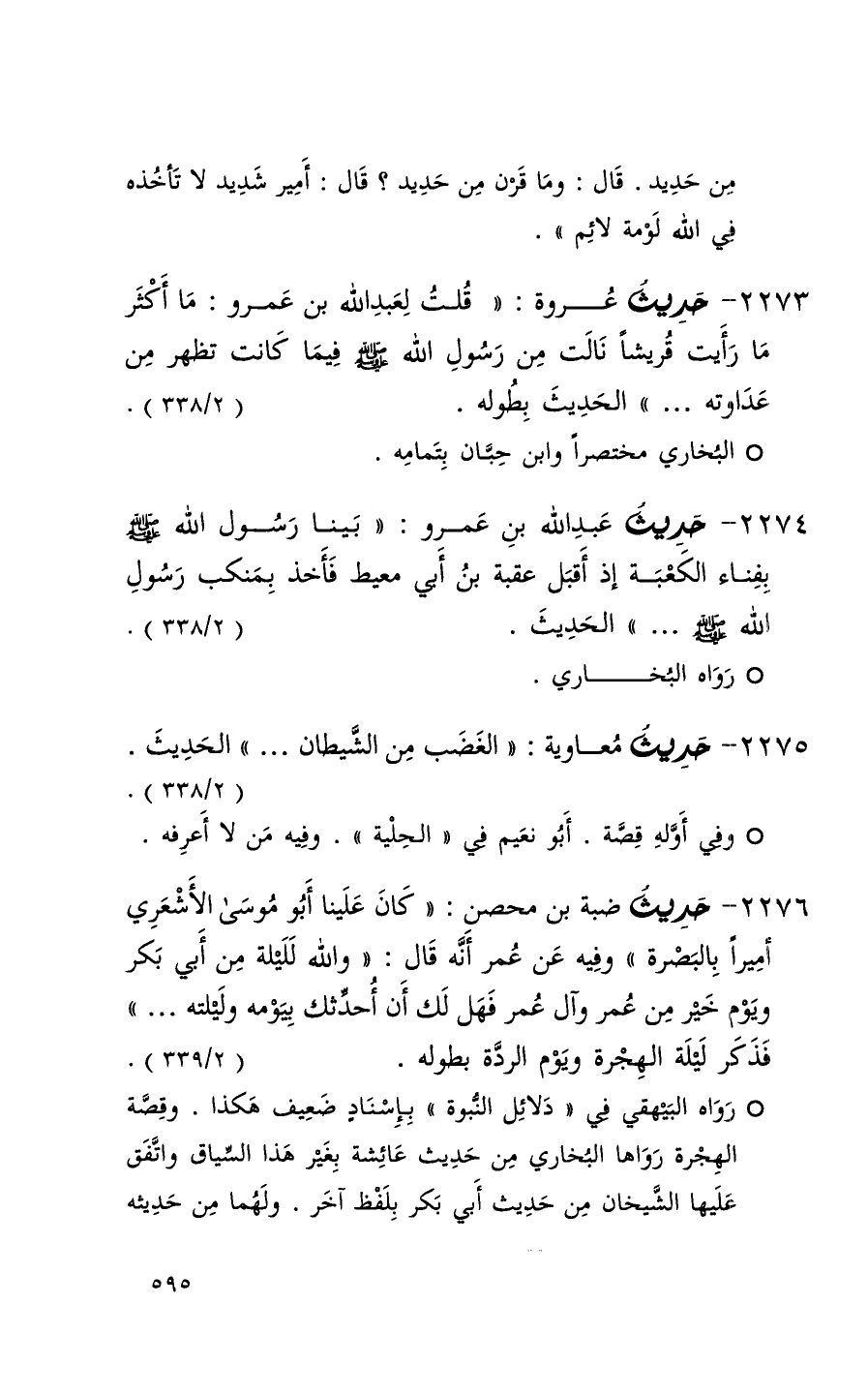 2273 حديث عروة ( قلت لعبد الله بن عمرو ما أكثر ما رأيت قريشاً نالت من رسول الله فيما كانت تظهر من عداوته 000 ) الحديث بطوله ( 2 / 328 )