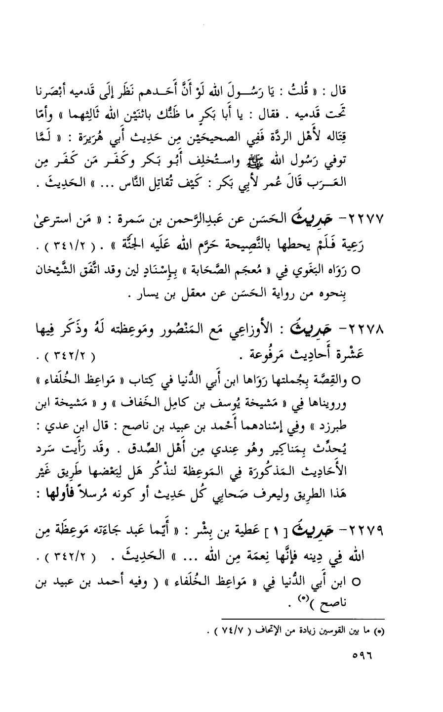 2278 حديث الأوزاعي مع المنصور وموعظته له وذكر فيها عشرة أحاديث مرفوعة + والقصة بجملتها رواها ابن أبي الدنيا في كتاب مواعظ الخلفاء ورويناها في مشيخة يوسف بن كامل الخفاف ومشيخة ابن طبرزد وفي إسنادهما أحمد بن عبيد بن ناصح : قال ابن عدي : يحدث بمناكير وهو عندي من أهل الصدق . وقد رأيت سرد الأحاديث المذكورة في الموعظة لنذكر هل لبعضها طريق غير هذا الطريق وليعرف صحابي كل حديث أو كونه مرسلاً فأولها +