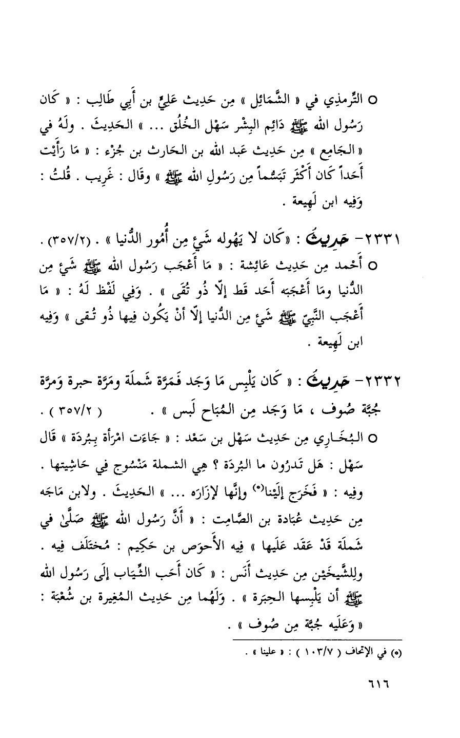 2332 حديث ( كان يلبس ما وجد فمرة شملة ومرة حبرة ومرة جبة صوف ما وجد من المباح لبس ) ( 2 / 357 ) + البخاري من حديث سهل بن سعد ( جاءت امرأة ببردة ) قال سهل هل تدرون ما البردة هي الشملة منسوج في حاشيتها وفيه ( فخرج إلينا وإنها لإزاره 000 ) الحديث ولابن ماجه من حديث عبادة بن الصمت ( أن رسول الله صلى في شملة قد عقد عليها ) فيه الأحوص بن حكيم مختلف فيه وللشيخين من حديث أنس ( كان أحب الثياب إلى رسول الله أن يلبسها الحبرة ) ولهما من حديث المغيرة بن شعبة و عليه جبة من صوف