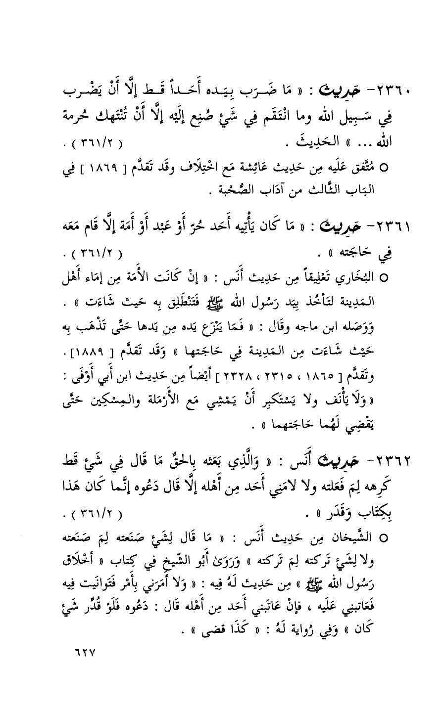 2360 حديث ( ما ضرب بيده أحداً قط إلا أن يضرب في سبيل الله وما انتقم في شيء صنع إليه إلا أن تنتهك حرمة الله 000 ) الحديث ( 2 / 361 ) (1)