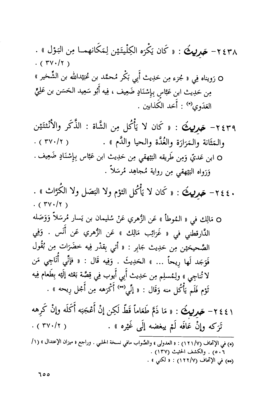 2440 حديث ( كان لا يأكل الثوم ولا البصل ولا الكراث ) ( 2 / 370 ) + مالك في الموطأ عن الزهري عن سليمان بن يسار مرسلاً ووصله الدارقطني في غرائب مالك عن الزهري عن أنس وفي الصحيحين من حديث جابر ( أتي بقدر فيه خضرات من بقول فوجد لها ريحاً 000 ) الحديث وفيه قال ( فإني أناجي من لا تناجي ) ولمسلم من حديث أبي أيوب في قصة بعثه غليه بطعام فيه ثوم فلم يأكل منه وقال ( إني أكرهه من أجل ريحه ) +