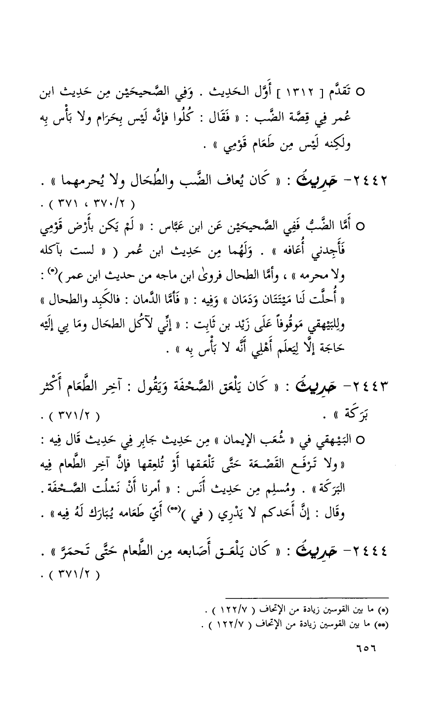 2442 حديث ( كان يعاف الضب والطحال ولا يحرمهما ) ( 2 / 370ِ 371 ) + أما الضب ففي الصحيحين عن أبي عباس ( لم يكن بأرض قومي فأجدني أعافه ) ولهما من حديث ابن عمر ( لست بآكله ولا محرمه ) وأما الطحال فروى ابن ماجه من حديث ابن عمر ( أحلت لنا ميتتان ودمان ) وفيه ( فأما الدمان فالكبد والطحال ) وللبيهقي موقوفاً على زيد بن ثابت ( إني لآكل الطحال وما بي إليه حاجة إلا ليعلم أهلي أنه لا بأس به ) +