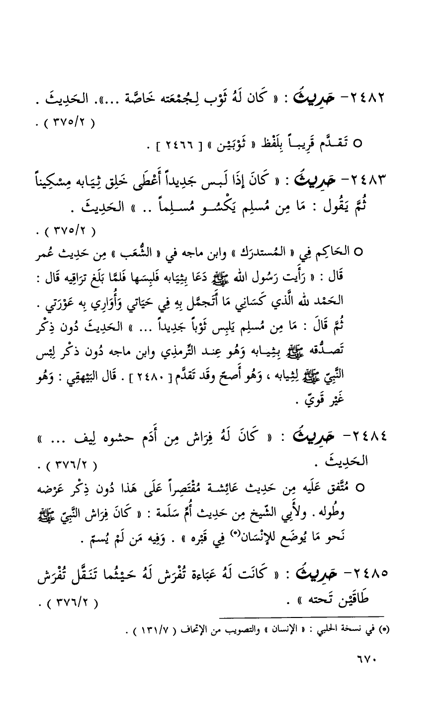 2483 حديث ( كان إذا لبس جديداً أعطى خلق ثيابه مسكيناً ثم يقول ما من مسلم يكسو مسلماً 000 ) الحديث ( 2 / 375 ) + الحاكم في المستدرك وابن ماجه في الشعب من حديث عمر قال ( رأيت رسول الله دعا بثيابه فلبسها فلما بلغ تراقيه قال الحمد لله الذي كساني ما أتجمل به في حياتي وأواري به عورتي ثم قال ما من مسلم يلبس ثوباً جديداً 000 ) الحديث دون ذكر تصدقه بثيانبه وهو عند الترمذي وابن ماجه دون ذكر لبس النبي لثيابه وهو أصح وقد تقدم 2480 قال البيهقي وهو غير قوي +