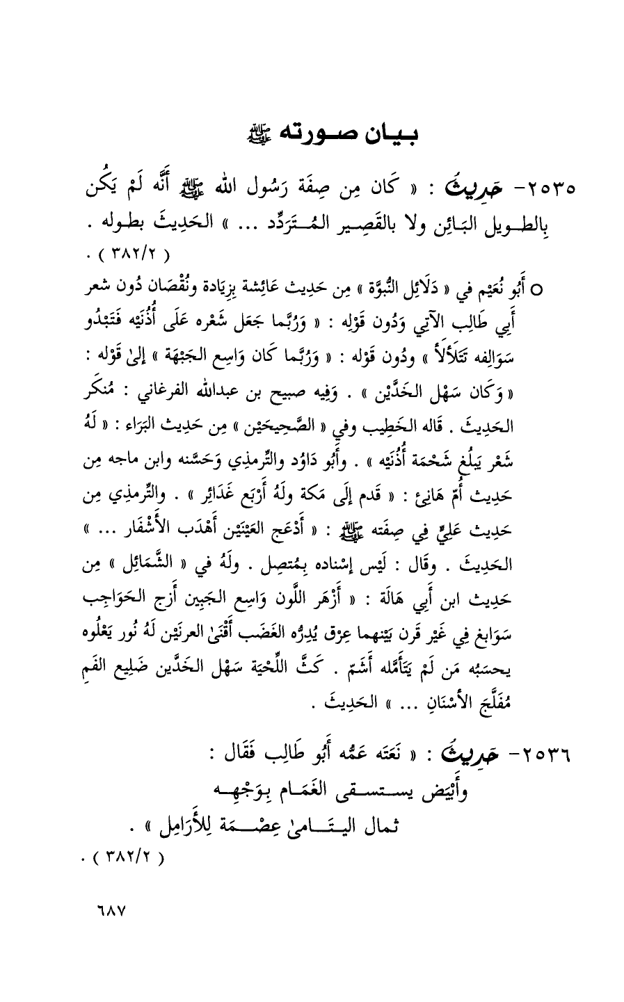 1- أبو نعيم في دلائل النبوة من حديث عائشة بزيادة ونقصان دون شعر أبي طالب الآتي ودون قوله : ' وربما جعل شعره على أذنيه فتبدو سوالفه تتلألأ ' ودون قوله : ( وربما كان واسع الجبهة ) إلى قوله ( وكان سهل الخدين ) وفيه صبيح بن عبد الله الفرغاني منكر الحديث قاله الخطيب وفي الصحيحين من حديث البراء ( له شعر يبلغ شحمة أذنيه ) وأبو داود والترمذي وحسنه وابن ماجه من حديث أم هانئ ( قدم إلى مكة وله أربع غدائر ) والترمذي من حديث علي في صفته ( أدعج العينين أهدب الأشفار 000 ) الحديث وقال ليس إسناده بمتصل وله في الشمائل من حديث ابن أبي هالة ( أزهر اللون واسع الجبين أزج الحواجب سوابغ في غير قرن بينهما عرق يدره الغضب أقنى العرنين له نور يعلوه يحسبه من لم يتأمله أشم كث اللحية سهل الخدين ضليع الفم مفلج الأسنان 000 ) الحديث