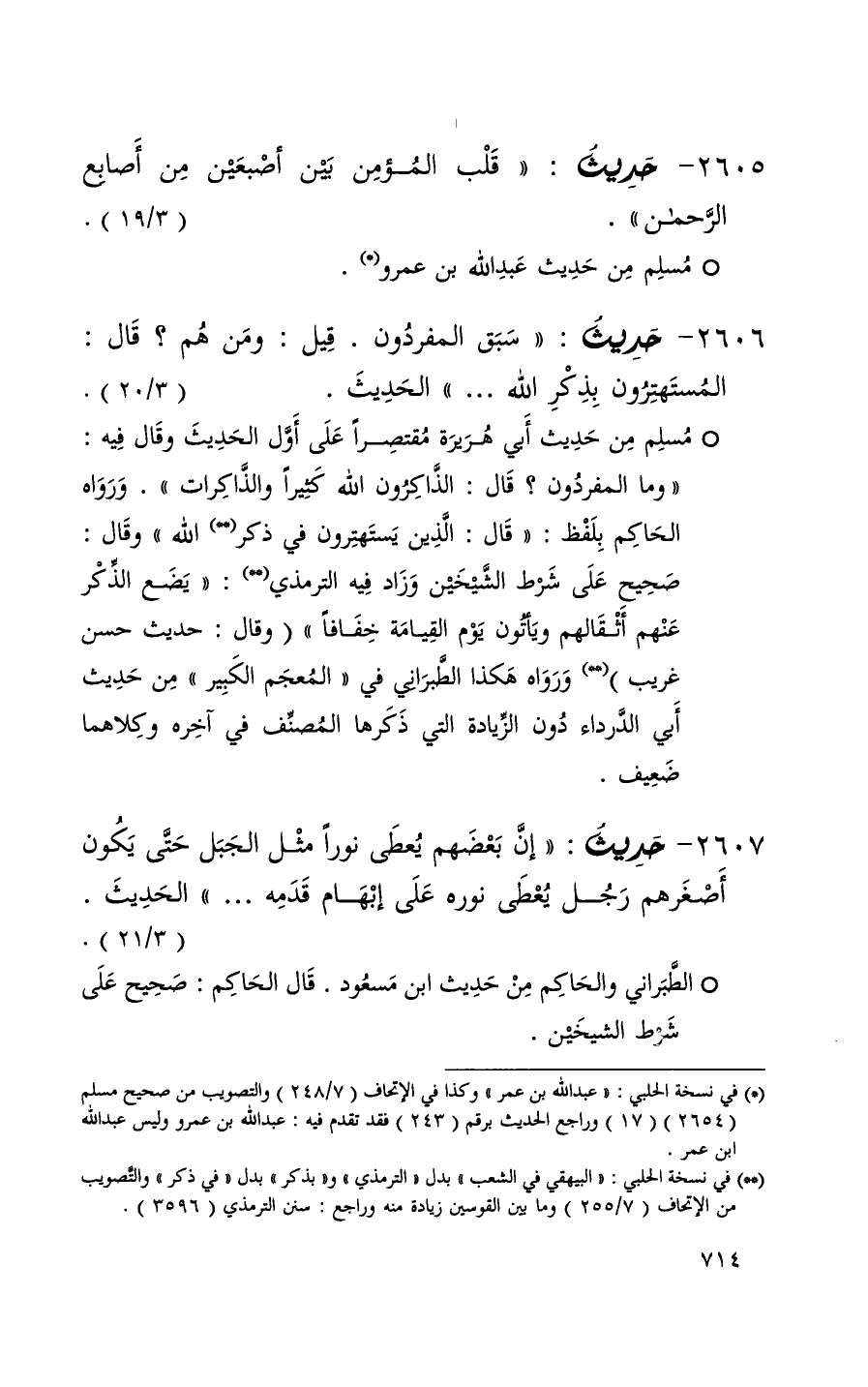 2606 حديث ( سبق المفردون قيل ومن هم قال المستهترون بذكر الله . . . ) الحديث ( 3 / 20 ) + مسلم من حديث أبي هريرة مقتصراً على أول الحديث وقال فيه ( وما المفردون قال الذاكرون الله كثيراً والذاكرات ) ورواه الحاكم بلفظ ( قال الذين يستهترون في ذكر الله ) وقال صحيح على شرط الشيخين وزاد فيه الترمذي ( يضع الذكر عنهم أثقالاً ويأتون يوم القيامة خفافاً ) وقال حديث حسن غريب ورواه هكذا الطبراني في المعجم الكبير من حديث أبي الدرداء دون الزيادة التي ذكرها المصنف في آخره وكلاهما ضعيف +