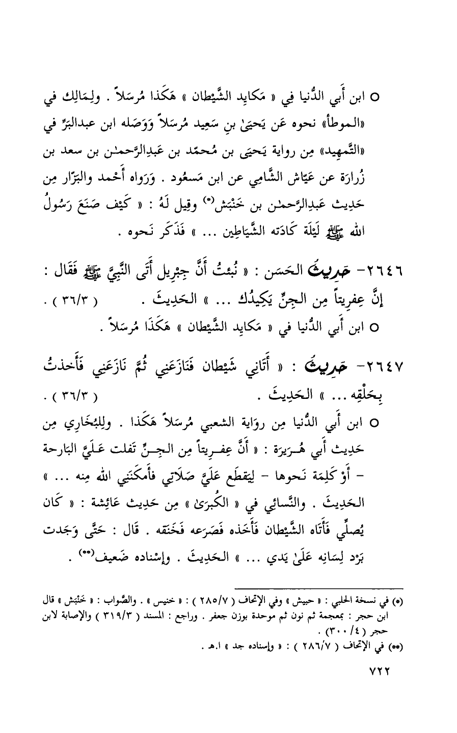 2647 حديث ( أتاني شيطاني فنازعني ثم نازعني فأخذت بحلقه . . . ) الحديث ( 3 / 36 ) + ابن أبي الدنيا من رواية الشعبي مرسلاً هكذا وللبخاري من حديث أبي هريرة ( أن عفريتاً من الجن تفلت علي البارحة أو كلمة نحوها ليقطع علي صلاتي فأمكنني الله منه . . . ) الحديث والنسائي في الكبرى من حديث عائشة ( كان يصلي فأتاه الشيطان فأخذه فصرعه فخنقه قال حتى وجدت برد لسانه علي يدي . . . ) الحديث وإسناده ضعيف +