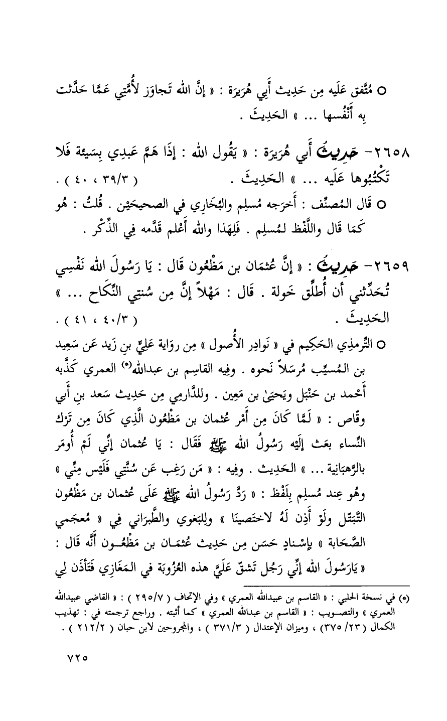2659 حديث ( إن عثمان بن مظعون قال يا رسول الله نفسي تحدثني أن أطلق خولة قال مهلا إن من سنتي النكاح . . . ) الحديث ( 3 / 40ِ 41 ) + الترمذي الحكيم في نوادر الأصول من رواية علي بن زيد عن سعيد بن المسيب مرسلاً نحوه وفيه القاسم بن عبد الله العمري كذبه أحمد بن حنبل ويحي بن معين وللدارمي من حديث سعد بن أبي وقاص ( لما كان من أمر عثمان بن مظعون الذي كان من ترك النساء بعث إليه رسول الله فقال يا عثمان إني لم أومر بالرهبانية . . . ) الحديث وفيه ( من رغب عن سنتي فليس مني ) وهو عند مسلم بلفظ ( رد رسول الله على عثمان بن مظعون التبتل ولو أذن له لاختصينا ) وللبغوي والطبراني في معجمي الصحابة بإسناد حسن من حديث عثمان بن مظعون أنه قال ( يا رسول الله إني رجل تشق علي هذه العزوبة في المغازي فتأذن لي