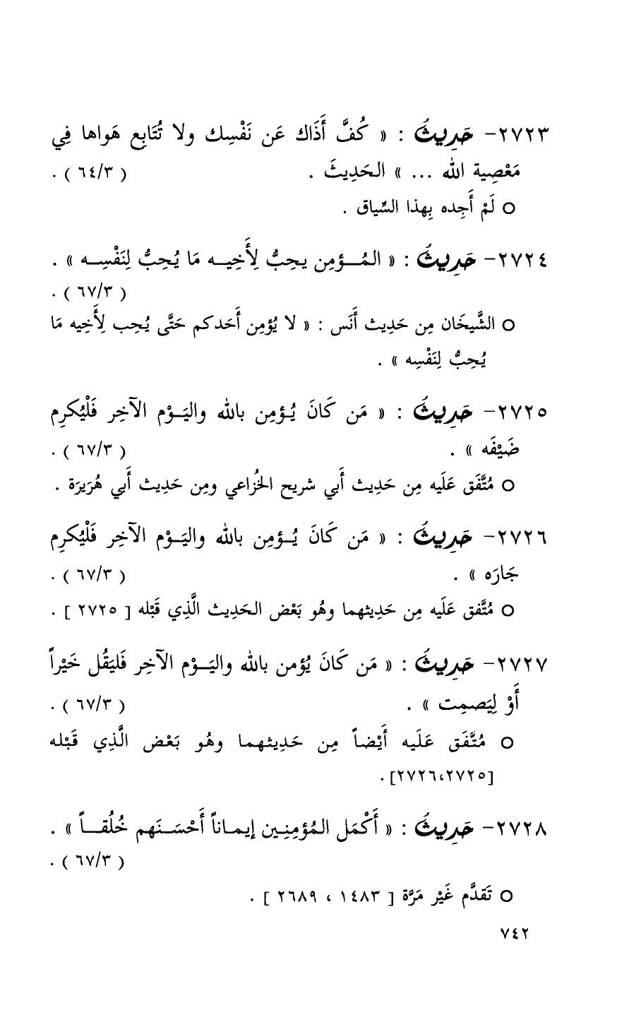 2727 حديث ( من كان يؤمن بالله واليوم الآخر فليقل خيراً أو ليصمت ) ( 3 / 67 ) + متفق عليه أيضاً من حديثهما وهو بعض الذي قبله 2725ِ 2726 +