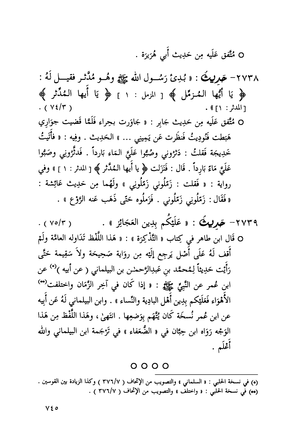 2738 حديث ( بدئ رسول الله وهو مدثر فقيل له ( ^ يا أيها المزمل ) المزمل ( ^ يا أيها المدثر ) المدثر ( 3 / 74 ) + متفق عليه من حديث جابر ( جاورت بحراء فلما قضيت جواري هبطت فنوديت فنظرت عن يميني 000 ) الحديث وفيه ( فأتيت خديجة فقلت دثروني وصبوا علي الماء بارداً فدثروني وصبوا علي ماء بارداً قال فنزلت ( ^ يا أيها المدثر ) المدثر 1 ) وفي رواية ( فقلت زملوني زملوني ) ولهما من حديث عائشة ( فقال زملوني زملوني فزملوه حتى ذهب عنه الروع ) +