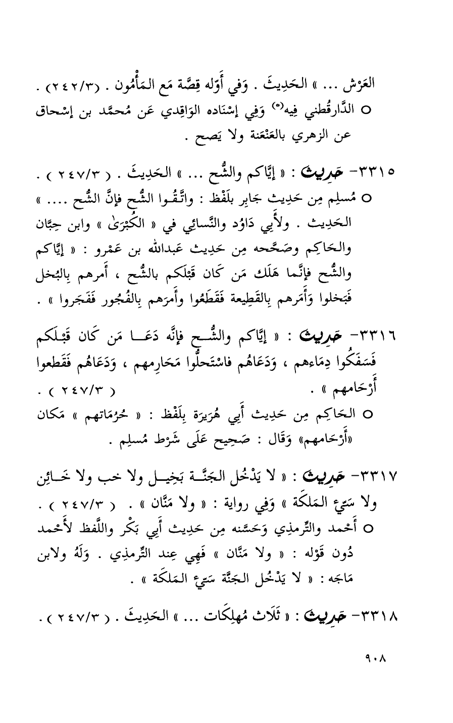3317 حديث ( لا يدخل الجنة بخيل ولا خب ولا خائن ولا سيء الملكة ) وفي رواية ( ولا منان ) ( 3 / 247 ) + أحمد والترمذي وحسنه من حديث أبي بكر واللفظ لأحمد دون قوله ولا منان فهي عند الترمذي وله ولابن ماجه ( لا يدخل الجنة سيء الملكة )