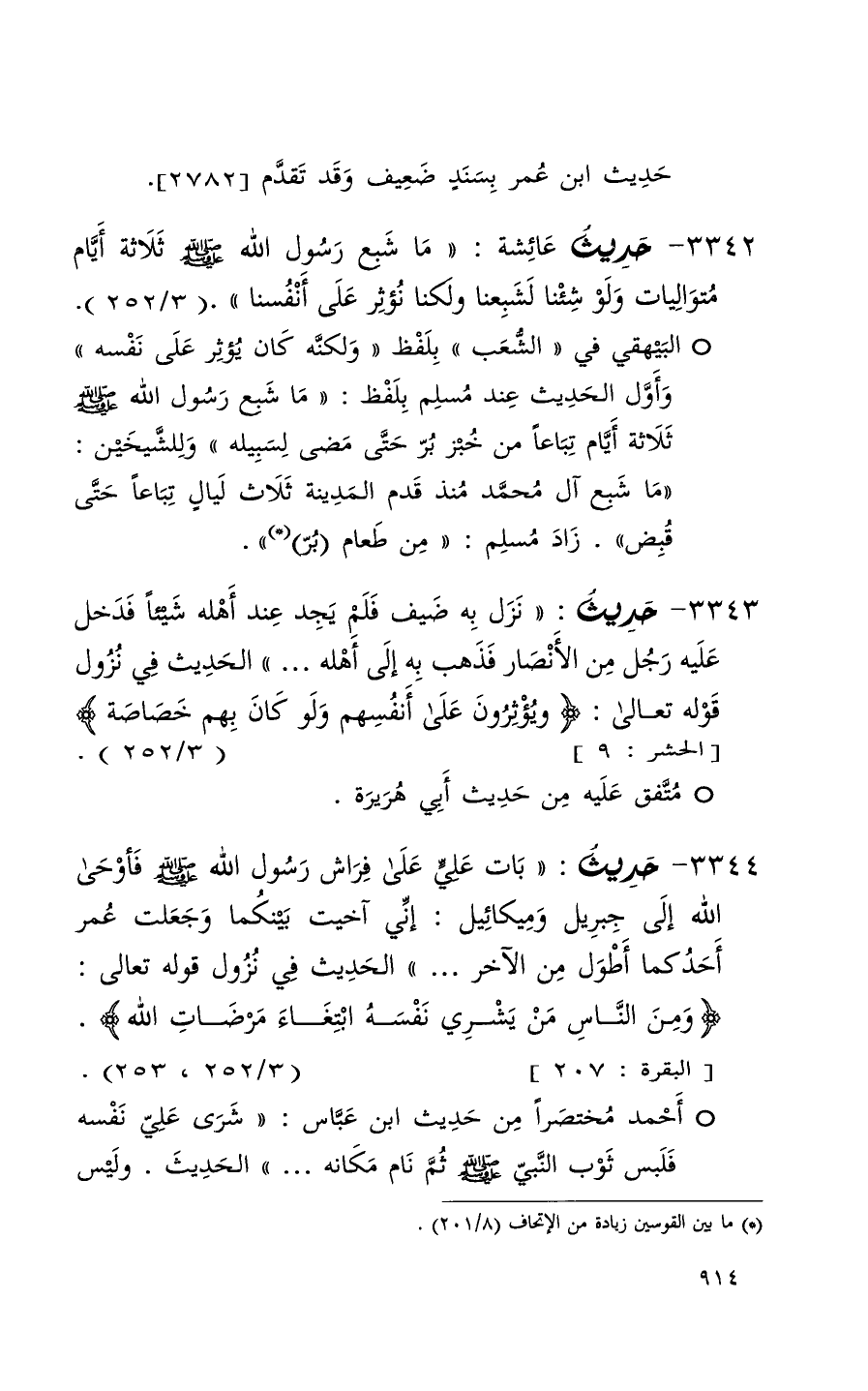 3342 حديث عائشة ( ما شبع رسول الله ثلاثة أيام متواليات ولو شئنا لشبعنا ولكنا نؤثر على أنفسنا ( 3 / 252 )