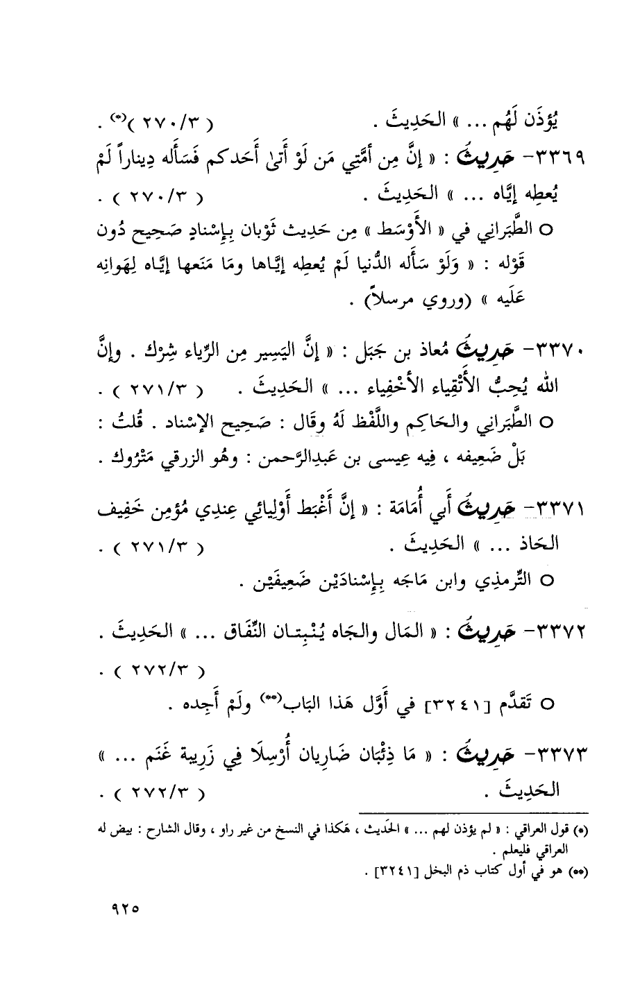 3373 - حديث : ' ما ذئبان ضاريان أرسلاً في زريبة غنم . . . ' الحديث ( 3 / 272 ) .