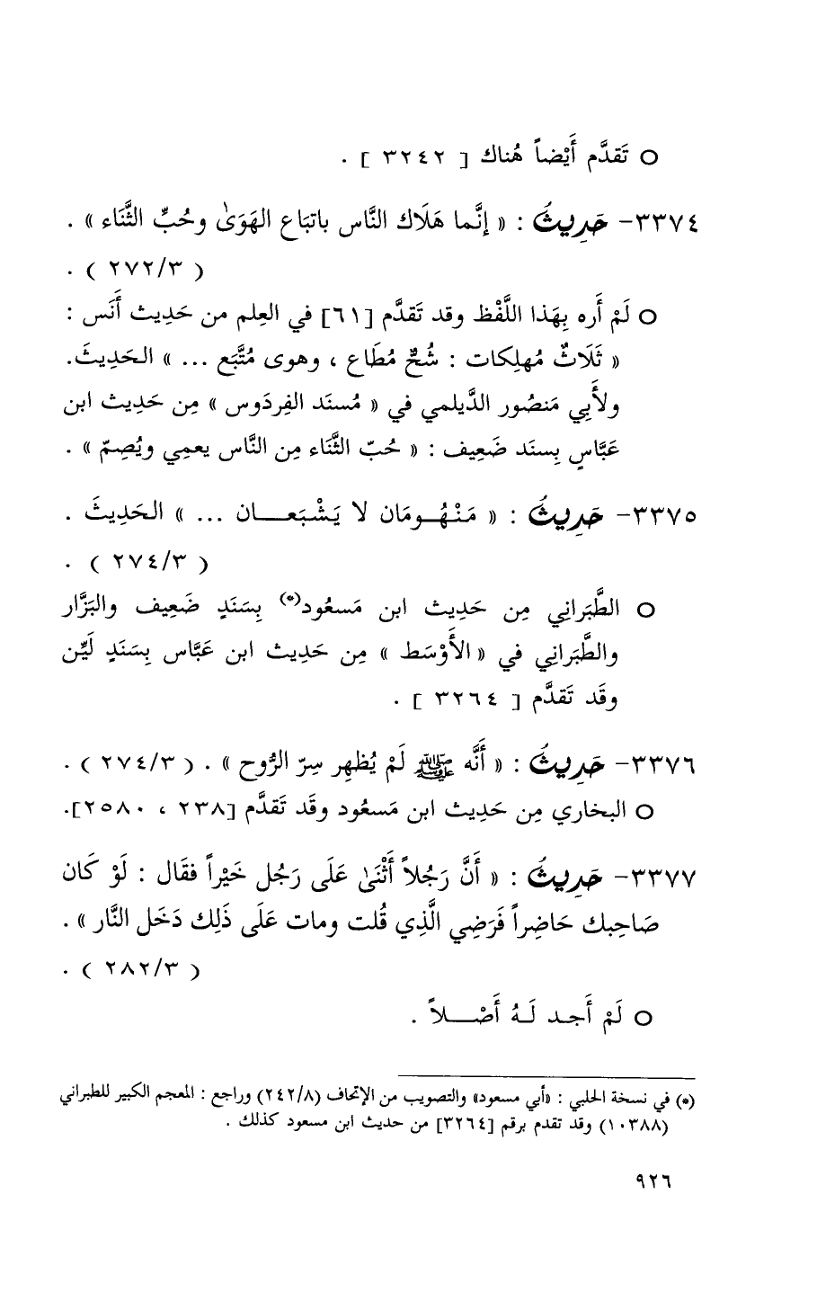 3374 حديث ( إ نما هلاك الناس باتباع الهوى وحب الثناء ) ( 3 / 272 ) + لم أره بهذا اللفظ وقد تقدم 61 في العلم من حديث أنس ( ثلاث مهلكات شح مطاع وهوى متبع 000 ) الحديث ولأبي منصور الديلمي في مسند الفردوس من حديث ابن عباس بسند ضعيف ( حب الثناء من الناس يعمي ويصم ) +